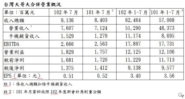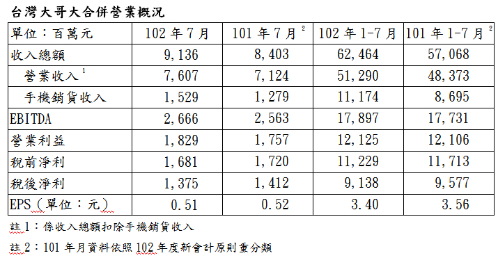 台灣大哥大公佈 102 年 7 月份自結合併營收為 91.4 億元,EBITDA 為 26.7 億元,營業利益 18.3 億元,稅後淨利 13.7 億元,稅後 EPS 為 0.51 元。102 年自結前七個月合併營收 624.6 億元,EBITDA 為 179 億元,營業利益 121.2 億元,稅後淨利為 91.4 億元,稅後 EPS 為 3.4 元。