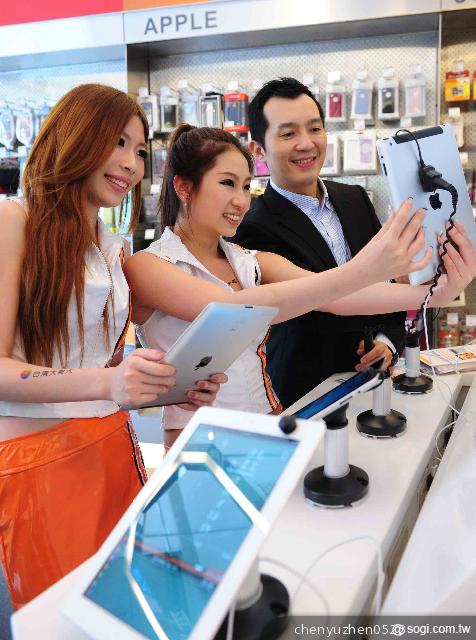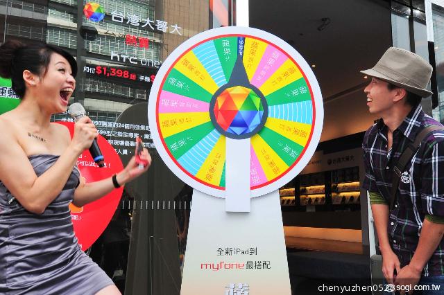 台灣電信業的第一次!台灣大哥大今(11)日正式宣佈開賣全新iPad,把全球最夯的平板電腦引進台灣。台灣大哥大上午於myfone台北威秀門市舉辦熱鬧的開賣活動,推出「蘋果幸運輪」遊戲,只要轉到「全新iPad」就有機會帶回全新iPad一台,一早就吸引大批民眾排隊試手氣,人氣強強滾。幾位民眾與「全新iPad」擦身而過,現場驚呼聲不斷。9時58分由幸運民眾贏走了「全新iPad」,high到最高點!