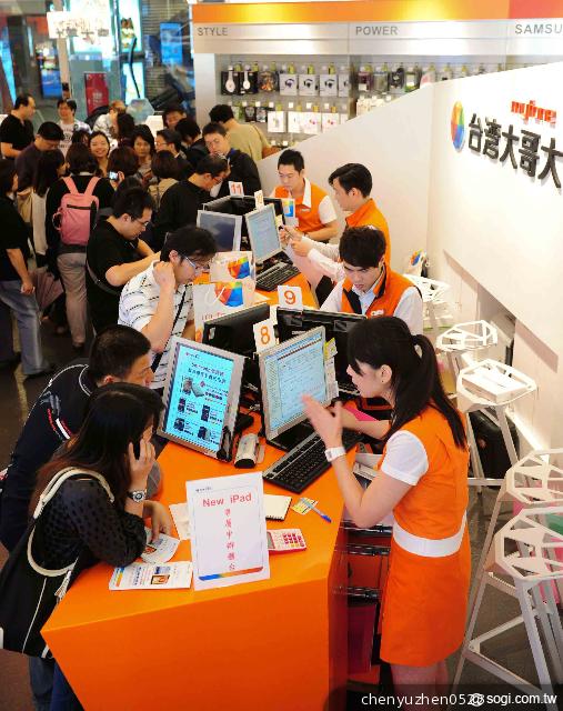 ▲民眾於台灣大哥大 myfone 門市搶辦、體驗全新 iPad