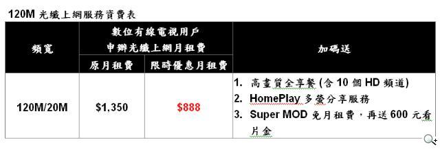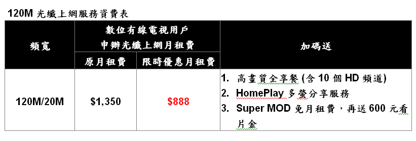 這次推出的 120M 光纖上網專案,以原價 66 折的 888 元,搭配 HD 全享餐、HomePlay 多螢分享,以及 Super MOD 三大服務免月租費等優惠,讓用戶在家中不僅能將影片、節目帶著走,使用平板、手機上網、看影片時再也不必擔心網路過慢而斷斷續續!台灣大寬頻全台旗下永佳樂、觀天下、聯禾 (註 1)、鳳信與紅樹林 (合作夥伴) 等 5 家數位有線電視系統台服務區內,將有超過九成以上的用戶可以申裝!