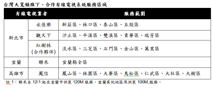 11 月 1 日起,消費者可透過台灣大寬頻免付費客服專線、台灣大寬頻官網、台灣大寬頻旗下數位有線電視系統台與台灣大寬頻服務區內的台灣大哥大 myfone 門市進行申裝。