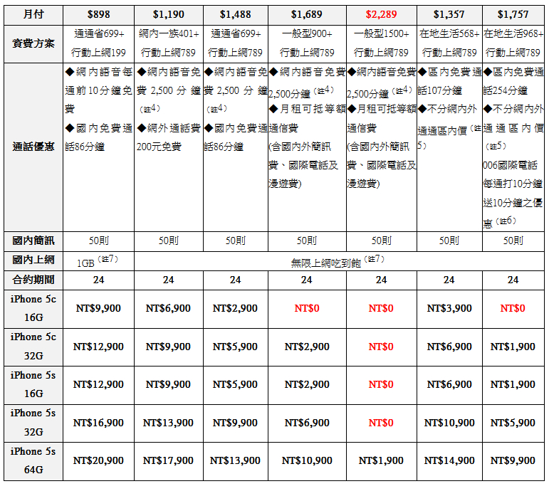 - 註 3. 手機 0 元係指搭配 iPhone 5S (16G/32G),須綁約 24 個月且需預繳,搭配語音 1500+ 行動上網 789。