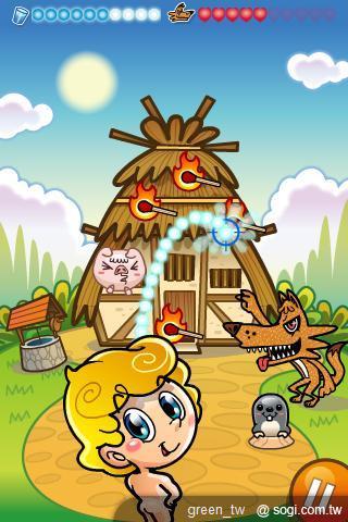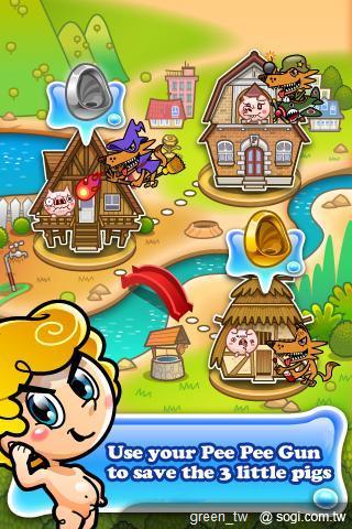 遊戲裡,還精心設計了許多小巧思,比方說:射中火把以外的角色或物件,像是邪惡的大野狼、可憐的三隻小豬或者是環境中的佈景,都可能觸動特殊反應,帶給玩家源源不斷的驚喜!另外,尿尿小童也有不同服裝可以更換,每款服裝的「Pee Pee Gun」功能也不盡相同,大大增強了使用者的樂趣!