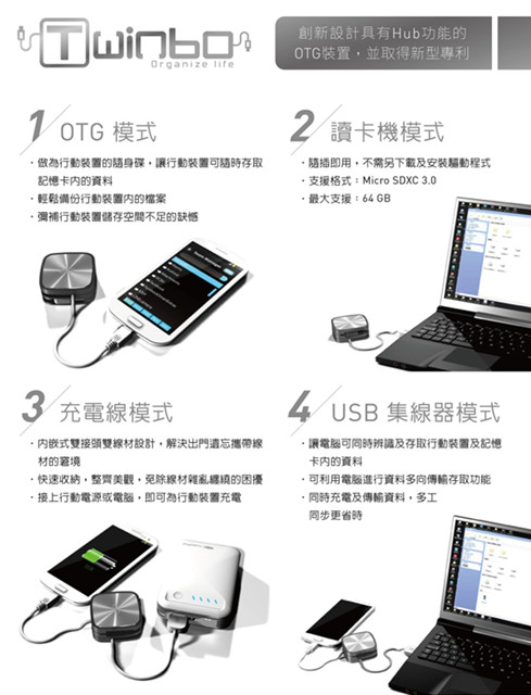 Twinbo 集結了讀卡機、資料傳輸線、充電線、捲線器、OTG 設備、隨身碟等功用,智慧地強化多功應用,並落實簡約生活的最佳理念,不僅一次滿足行動裝置使用者的各項需求,亦能節省購滿其他配件的成本及減輕外出所需攜帶的重量,為消費者省時、省力、省荷包,輕鬆享受更有效率的節約生活。