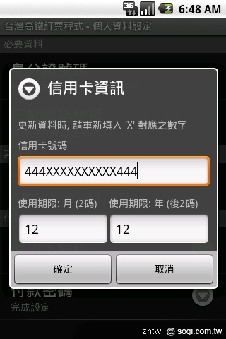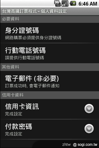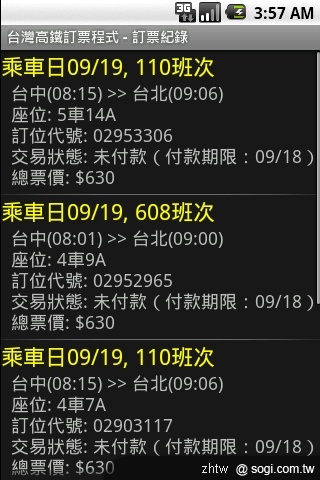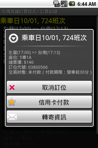 謝啦~幫你收錄到軟體館 ^^台灣高鐵訂票查詢程式介紹提供以下功能: 1. 查詢班次 2. 訂票 3. 取消訂票 4. 信用卡付款 5. 記錄查詢 6 轉寄資訊使用 AES256 進行信用卡資訊編碼 >> 保密資訊不外洩, 完全手機操作方便訂票付款, 必須輸入自行定義的密碼 才可以使用付款功能, 防止非授權使用.安裝程式: 在 Android Market 裡 搜尋 "高鐵" 後找尋 icon 如下圖即可以找到本程..........恕刪
