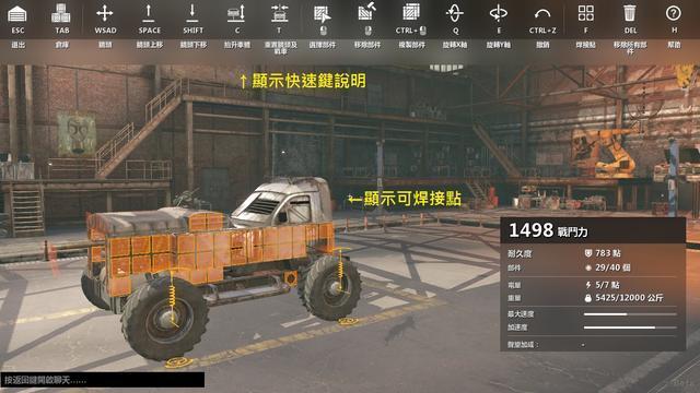 組裝介面如下圖,按H鍵後,會出現所有快速鍵的操作說明;其中比較重要的是,按F鍵可顯示所有焊接點,有焊接點處才能組裝武器、散熱器或加速器等功能部件。