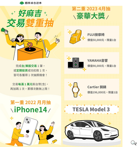 作者:Peterson網址:https://istockapp.cathaysec.com.tw/Marketing/MMBOAO/ 活動期間,完成台/美股交易1筆,或定期投資成功扣款1次,各得1次抽獎機會。一般交易每滿新台幣1萬元(含),再加碼1次,累積次數無上限。 獎項:iPhone14、特斯拉Mo...