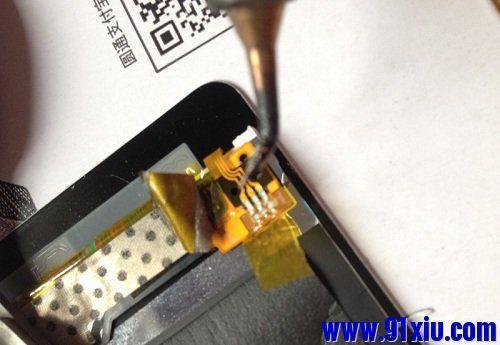 7、取下顯示幕,撕開排線上的膠布,看到背光排線焊點。