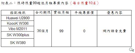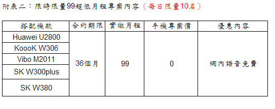 第三大好康:限時限量超低 99 月租專案,網內語音暢打免費,每日限 10 名申辦。