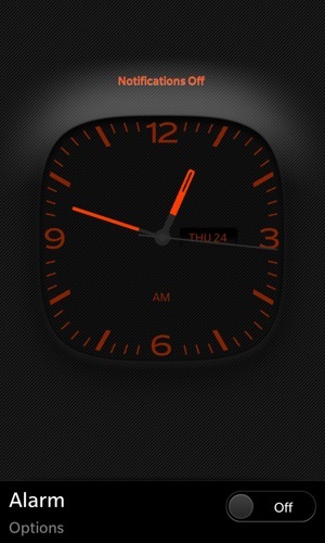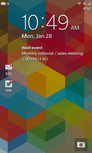 ▲左圖為 BlackBerry Z10 鎖定頁面,顯示了 BlackBerry Hub 中有多少封未讀訊息,螢幕右下角為相機快捷鍵;右圖為 BlackBerry Z10 待機時鐘顯示狀態,用戶可根據個人喜好自行設置鬧鐘提醒及調節時鐘周圍區域的亮度顯示效果。(圖片來源:The Verge)