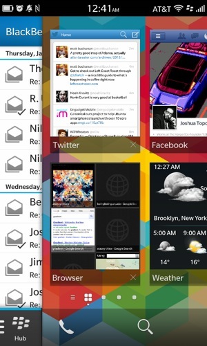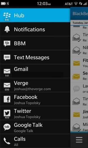 ▲BlackBerry Z10 擁有「BlackBerry Hub」功能,是 BlackBerry 最方便與獨特的功能之一,可透過它查看到所有提示的消息,包含 BBM、郵件、Facebook 資訊、Twitter 提示等等,用戶在任何介面中向上拉,然後再往右一拉即可快速進入 BlackBerry Hub。(圖片來源:The Verge)