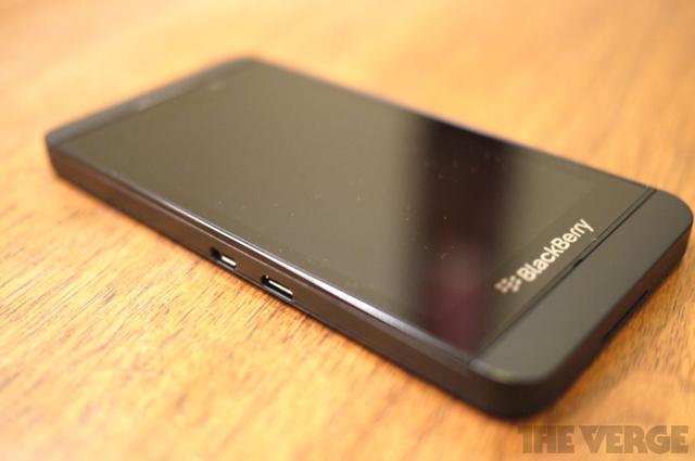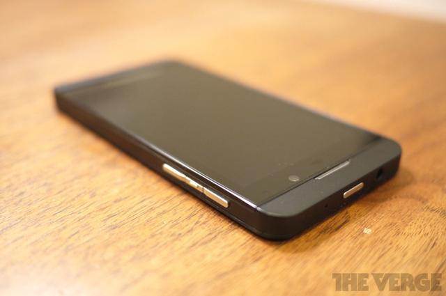 ▲BlackBerry Z10 手機左右兩側採用與 Apple iPhone 4 / 4S / 5 類似的 90 度直板線條設計;手機右側設置音量控制鍵與相機快捷鍵;手機頂端設有電源鍵與 3.5mm 耳機孔。(圖片來源:The Verge)