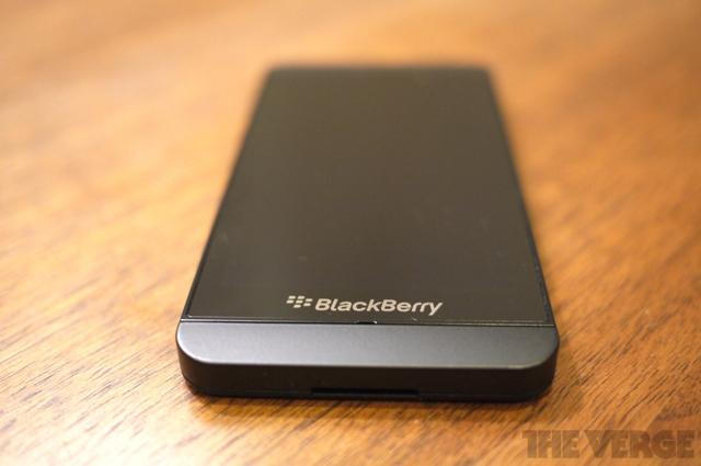 ▲BlackBerry Z10 螢幕下方印有 BlackBerry LOGO;手機底端除了設有便於開啟後蓋的凹槽外並未設置其他接口。(圖片來源:The Verge)