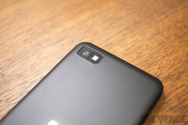 ▲BlackBerry Z10 手機背部左上方配備 800 萬畫素相機與 LED 補光燈。(圖片來源:The Verge)