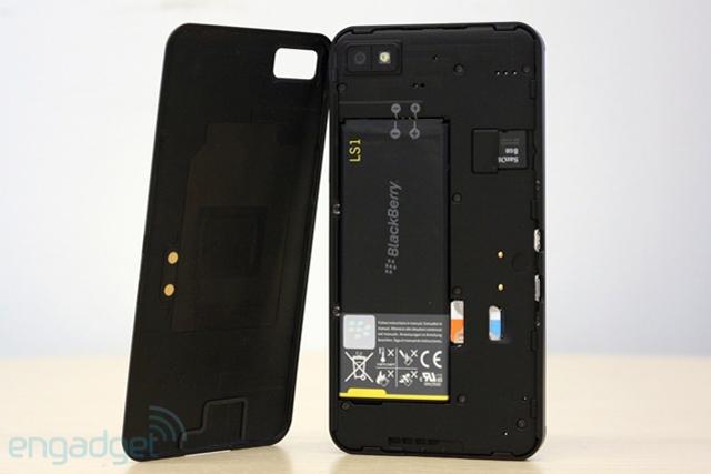 ▲BlackBerry Z10 採用可拆卸式背蓋設計,手機背部左邊配備1,800mAh 可拆式電池、右邊設置 microSD 卡插槽與 microSIM 卡插槽。(圖片來源:Engadget)