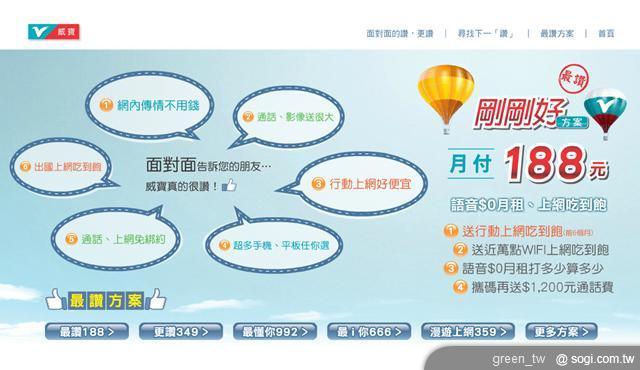 而為提供消費者輕鬆無負擔的通訊上網服務,威寶加碼推出「最讚 188」及「更讚 349」資費,除專案原有贈送國內通話費、近萬點 WIFI 上網吃到飽及 349 專案提供網內互打免費外,專案合約前六個月均享行動上網吃到飽,合約期限再享免費數據傳輸同時由 1GB 升級 1.5GB 好康,而習慣使用預付卡的用戶也可以購買旺卡「最 i 你 666 雙享包」,只要 666 元即可以 6.8 折 (原價 984 元) 享網內及行動上網 33 天免費吃到飽,再贈國內通信費 150 元等超值優惠。