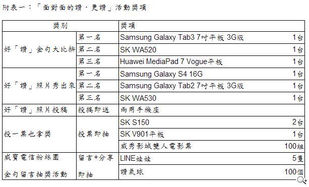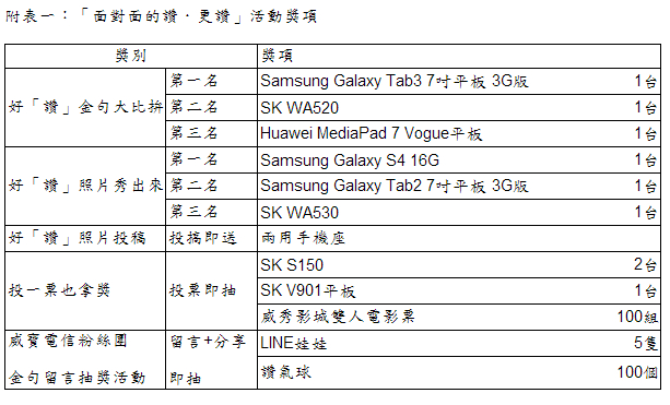 除了參加活動,8/9~8/23 活動期間加入臉書 (FB) 威寶電信粉絲團,留言「面對面的讚.更讚」金句並同時分享,就有機會得到超夯「LINE 娃娃」及「讚氣球」等好禮。