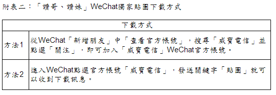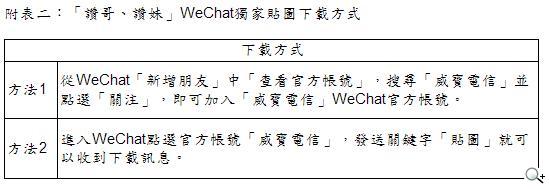 科技的進步讓「溝通」愈來愈方便,但似乎逐漸變得流於形式,威寶電信為喚起消費者溝通的熱情,推出全新品牌概念「面對面的讚.更讚」廣告訂於 7 月 31 日晚上 19:45~20:15 於新聞頻道 (51 台~55 台) 首播,貼心提醒大家面對面的溝通最為動人,同時於 8 月 1 日至 8 月 31 日期間推出一系列網路投稿、投票、抽獎活動,獎項包括旗艦手機、平板電腦、雙人電影票及時尚兩用手機座等,此外免費即時通訊軟體正夯,威寶特與 WeChat 合作推出「讚哥、讚妹」獨家貼圖,只要下載 WeChat 並關注「威寶電信」官方帳號,就可免費下載 16 款超萌可愛的獨家貼圖。