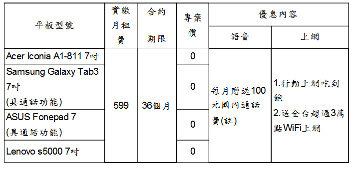 第一優惠:新申辦、續約或攜碼並搭配 599 (含)以上月租型方案,即可獲得韓國台北首爾來回機票,還可以將三星、華碩、宏碁等超夯品牌平板 0 元起帶回家(詳附表)。