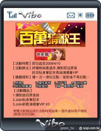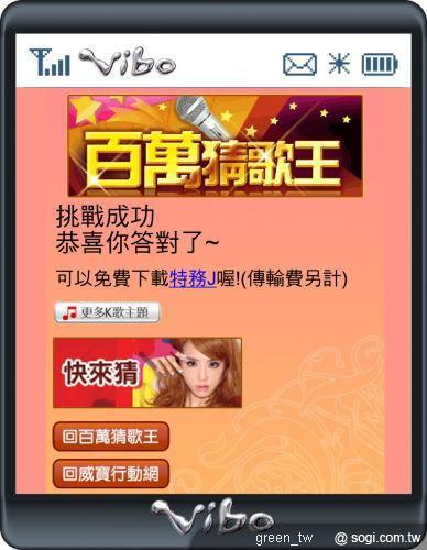 連上「VIBO行動網」,即可申裝「百萬猜歌王」,月付只要90元,就可輕鬆享受最新專輯、熱門歌曲排行的和絃鈴聲、原音鈴聲、全曲MP3以及音樂MV下載。音樂下載功能外,還可線上猜猜樂,其中「百萬猜歌王」挑戰專區提供多種主題,用戶進行全能K歌王挑戰時,每個題目猜一次扣點數5點就可猜題,答對者即可免費下載該首原音鈴(每首價值20-25元),未來更將定期更新遊戲方式,讓用戶可一直嘗鮮玩各種新遊戲。