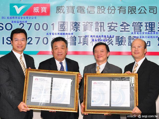 威寶電信昨(9)日榮獲 BSi 英國標準協會頒發「ISO 27001 國際資訊安全管理系統」暨「NCC ISO 27011 增項稽核項目」證書,成為國內第一家全資訊服務系統同時通過 ISO 27001 / CNS 27001 雙標準驗證的 3G 行動通信業者,顯示威寶對於客戶服務、營運管理及行政支援等全資訊服務系統的安全,已建立最周全的標準。