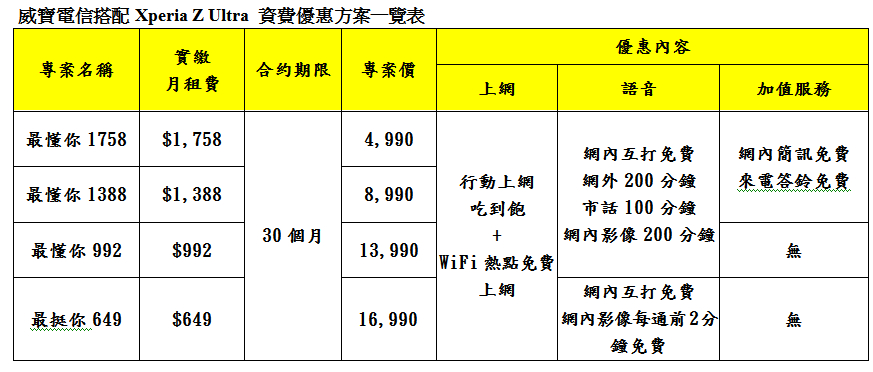 威寶電信(22)日宣布,從 7 月 24 日 12:00 至 7 月 26 日 11:59 止,全台開放預購 SONY 6.4 吋 Full HD 大螢幕防水新機 Xperia Z Ultra,搭配威寶「最懂你 1388 專案」只要 8,990 元,便可享網內互打、每月 500 分鐘通話、行動上網吃到飽、網內簡訊、Wi-Fi 熱點上網及 700 來電答鈴平台使用等六大免費超值好康,攜碼來威寶再享手機折價 1,000 元。預購成功並於指定時間取貨的消費者再加送原廠「時尚輕薄皮套及磁扣式充電座」等預購好禮。