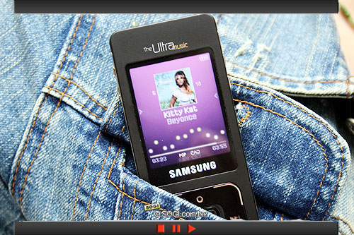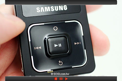 在進入音樂的播放介面之後,SAMSUNG 為 F308 設計了 4 向操控滑動觸控按鍵,以取代傳統的按鍵,帶來全新的操作體驗。一按下去即優雅的亮起白色按鍵燈,在停止操作之後,按鍵燈在短時間內自動關閉,使得 F308 得以保有簡約的機身設計。