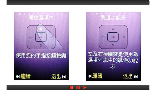 在觸碰式按鍵當中,左、右兩個接觸鍵為選項列表中跳到前後一個功能之用,上接觸鍵可開啟開功能的下一層目錄選單,而下接觸鍵則是返回的功能,可依照圖示輕鬆的了解並操作。在啟動音樂功能的時候,感應區輕輕由左向右滑,可顯示專輯、歌曲名稱和全部歌曲,並顯示最近已播放音樂、播放最多的音樂和播放清單;在感應區上由右向左滑,則是音樂播放功能的設定,如重複播放、隨機播放、3D 音效和音場設定等。同時,在播放音樂的時候,在感應區由上往下滑、或是由下往上滑,則是可以調整音樂播放的音量。了解這些基本的操作方式之後,便可發現獨特的播放系統讓多結構目錄的操作導航更為簡易、靈活。