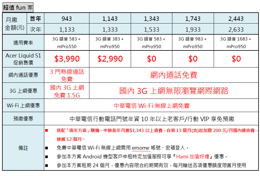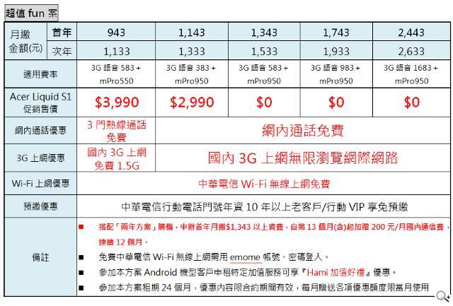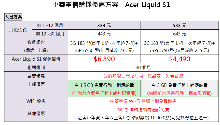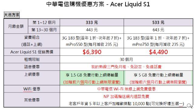 獨家搭配中華電信大省方案 Acer Liquid S1 4,490 元起