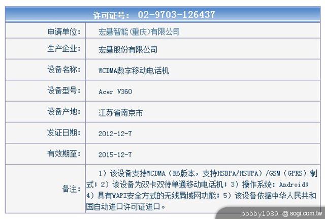▲根據中國工信部網站消息指出 Acer V360 已在 12 月 7 日獲得入網證書,中國工信部頒發的許可證號為 :02-9703-126437,搭載 Android 作業系統,是款支援 WCDMA /GSM 網路頻率的雙卡雙待手機,看來是針對聯通用戶推出的版本。(圖片來源:tenaa電信設備進網管理)