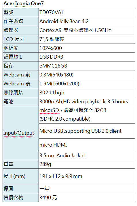 宏碁平價平板 Iconia One7 具有 7 吋窄邊框螢幕,白色外觀設計,僅 289g,輕巧好攜帶,搭載 Andorid4.2 作業系統、雙核心處理器 1.5GHz 及 1GB DDR3 RAM,滿足基本運算需求。