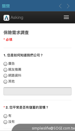 因為不知道方法,一開始我幾乎是以亂槍打鳥的方式在開發客戶,我那個朋友就有跟我說這樣不行,有時候花時間下功夫找真正的目標客戶遠比亂槍打鳥來得有效,所以後來我很認真的在想要怎麼找到真正有需求的人,我的直覺就是直接問是最快的,利用幾個問題判斷對方有沒有意願或是有沒有可能繼續發展成目標客戶,比我對任何人都用同一套方法有效的多,因為工作的關係,很常在外面跑,所以我就上網找有沒有類似問卷的App比較方便,就找到Asking,不過一開始我對問卷調查也沒有概念,問卷的設計、話術這些都需要慢慢累積,所以我就直接跟大家分享目前我的方式,根據你的實際狀況,還是要適時地做調整才能達到最好的效果