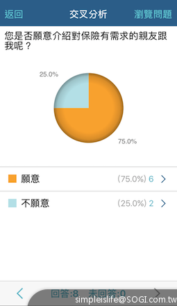 在外面跑業務的時間真的是分秒必爭,還好這個App會自動統計,我就可以隨時在手機查看結果,而且也能做交叉分析,好處是如果剛好客戶在旁邊,有什麼意見可以馬上處理,像是他對我剛剛介紹的產品有不懂的地方