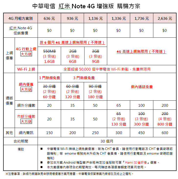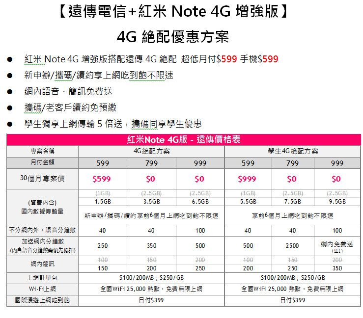 紅米 Note 4G 增強版,單機市售價為 NT$4,799 元,且將於 11 月 25 日中午 12:00 在小米網台灣站開賣,並於 11 月 20 日中午 12:00 起至 11 月 24 日上午 11 點 59 分止期間接受開賣當日的購買資格預約,並預定 12 月 1 日起於中華電信與遠傳電信門市開賣。另,小米手環在台市售價為 NT$395 元,小米路由器 mini 在台市售價為 NT$665 元,此二項產品亦預計於 12 月起陸續於小米網台灣站開賣。