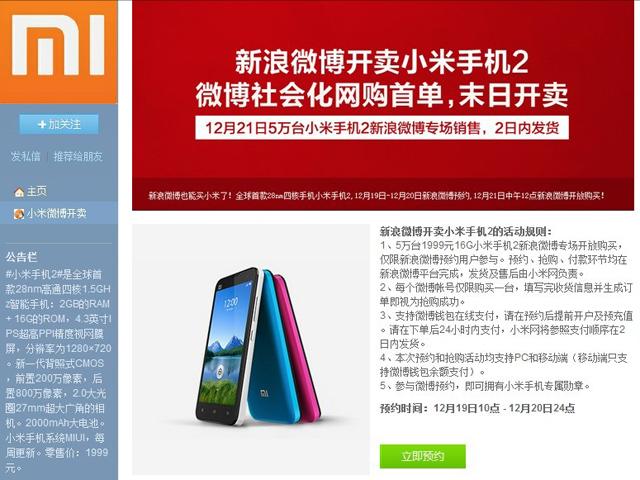 Xiaomi 小米手機 2 MI2 繼上次自家官網限量十萬台搶購後又在中國大陸新浪微博平臺以空機價 1,999 元人民幣(折合新台幣約 9,323 元)限量 5 萬臺開賣,此次搶購僅限新浪微博預約用戶參與,一個微博帳號限購一台手機。據悉,用戶可在 12 月 19 日 10:00 - 20 日 24:00 進行預約,21 日中午 12 點開放購買,用戶需透過「微博錢包」在下單後 24 小時內完成支付,小米官網將按照支付順序在兩日內發貨。此次搶購活動,預約、搶購、付款環節均在新浪微博平臺完成,發貨及售後由小米官網負責。微博用戶點擊「立即預約」並轉發分享小米手機官方微博不僅可以獲得搶購資格,還能參與限量 20 臺 Xiaomi 小米手機 2 MI2 有獎轉發活動,有機會免費贏得該款手機;小米公司建議用戶預約成功後提前開啟「微博錢包」並充值,有機會獲得價值 50 -1,999 元(折合新台幣約 233 - 9,323 元)的大禮。