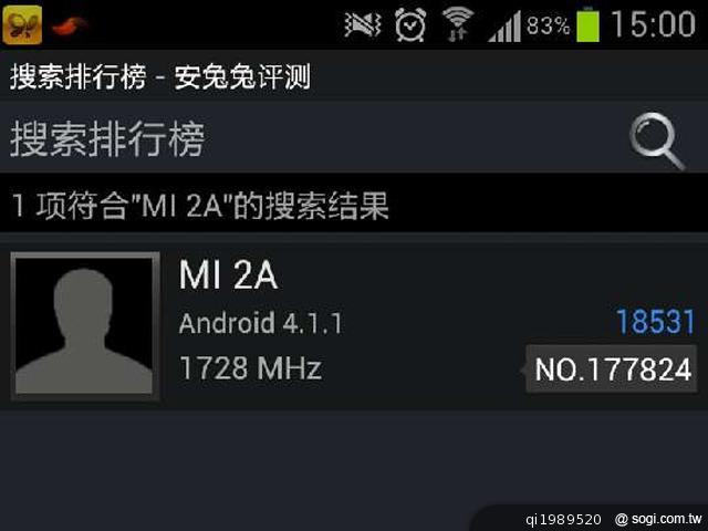 ▲從安兔兔軟體顯示的資料來看,型號為 MI2A 的手機在安兔兔軟體測試中獲得 18,531 分,該機採用 Android 4.1.1 作業系統,搭載主頻為 1.7GHz 的處理器,應是此前傳聞獲得中國工信部認證的小米手機 MI2A。