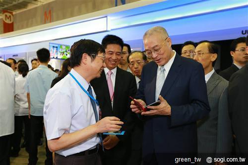 ▲工研院顯示中心副主任陳來成向副總統吳敦義介紹觸控面板的應用。