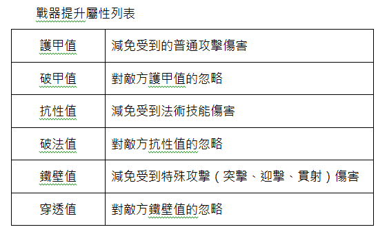 戰器共分為刀、劍、槍、弓、扇五種類型,每種類型所提升的基本屬性均有不同。有些戰器主打智力提升,有些則以提升傷害、兵種為主。每位武將都有自己適合裝備的戰器類型,玩家們可以根據自己武將的特性,為該武將選擇最適合的屬性戰器。