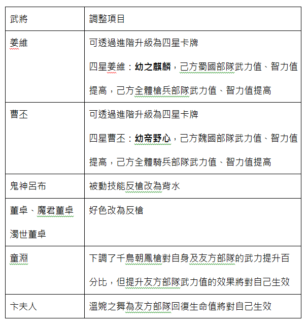 為了維持遊戲本身的平衡性與多樣化的策略玩家,官方於本次改版中針對某些武將進行調整,手上擁有這幾張卡牌的玩家,可要多留意他們未來的發展性了。