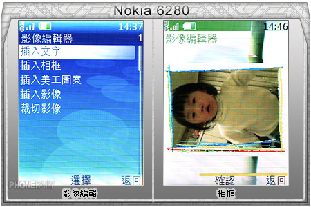 除了拍下精彩畫面外,相片的加工也不需要再費力的使用電腦編輯,可以透過 Nokia 6280 直接動手。因為 Nokia 6280 內建的影像編輯器,舉凡插入文字、插入相框、插入美工圖案、插入影像、裁切影像等,都可直接在手機上完成編輯。想將加工後的檔案分享?Nokia 6280 附有 USB 傳輸線可與電腦連結傳輸檔案,亦支援藍芽、紅外線等傳輸。