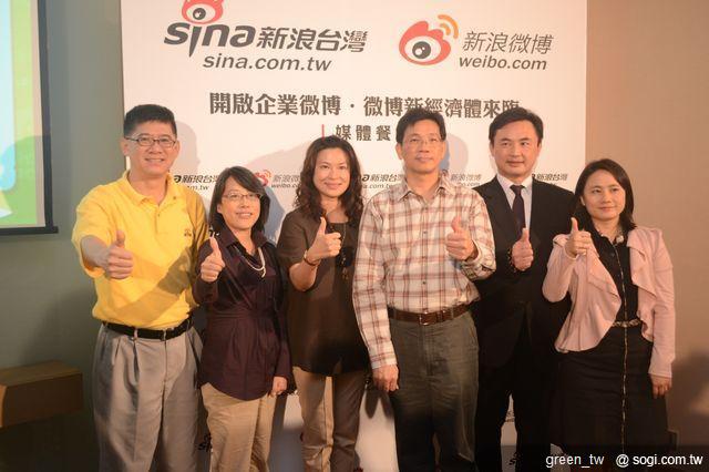 ▲新浪台灣總經理林啟文(右三)、新浪台灣副總經理李蓓芬(左二)、新浪微博全球媒拓總監陳國柱(左一)與三位旅遊觀光相關中小企業及達人共同見證微博新經濟,開創品牌微行銷。