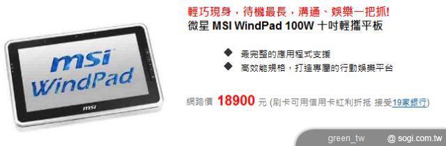 微星科技國內業務部產品經理林世宗指出,MSI WindPad 100W 平板主要針對企業端與商務人士設計,採用 Intel 行動平台處理器與 Windows 作業系統,內建 10.1 吋多點觸控螢幕、雙視訊鏡頭、G-Sensor 重力感測裝置、ALS 光感應等多項高規格硬體配備,電池續航力更高達 6 個小時以上,是目前該系統平板電腦,電池續航力最長者。春電展現場共提供 Wi-Fi 版與 3G + Wi-Fi 版兩項機款,各以 NT$18,900(含稅)與 NT$22,900(含稅)現場曝光價回饋給消費者。