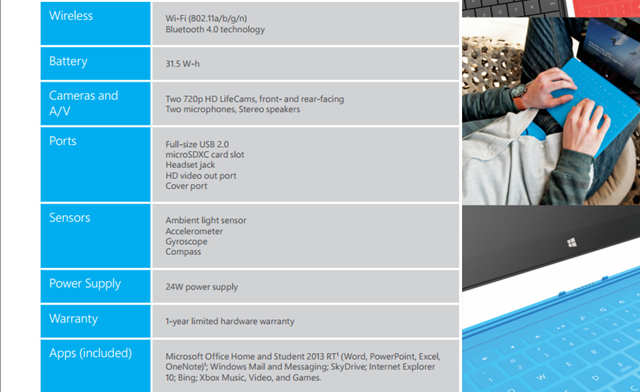 ▲Surface RT 支援 Wi-Fi、藍牙 4.0、USB 2.0、雙攝像頭、720P 影片攝錄等功能;內建 3,100mAh 電池,24W 電源供電。