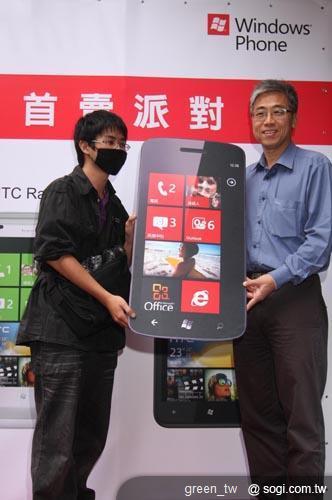 ▲中華電信行動通信分公司行銷處處長胡學海(右),與獲得首賣會開賣第一支 Windows Phone Mango 手機的林先生(左)合影。