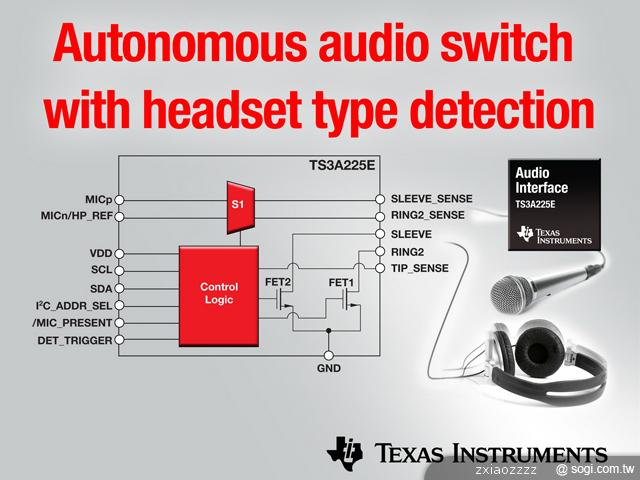 德州儀器 (TI) 宣佈推出最新音訊耳機檢測及配置開關 IC,該單晶片可支援一般耳機音訊應用。 TS3A225E 在單一元件中整合自動檢測與開關功能,避免終端設備設計採用獨立式元件 (discrete components) 而產生的檢測、漏電與雜音問題,極適合智慧型手機、平板電腦、筆記型電腦、音訊基座 (audio dock) 及家用音響等終端設備。詳細產品資訊與樣品訂購,請參見網頁:www.ti.com/ts3a225e-pr。