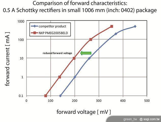 - 低正向電壓促使功耗下降,進而延長電池壽命。