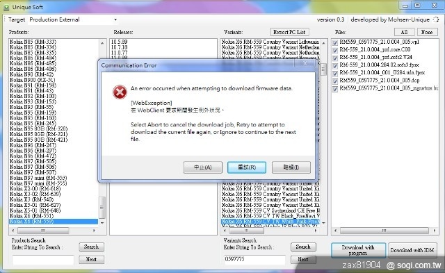同學最近新買一隻X6 叫我幫他刷機但今天開navifirm要下載刷機用的資料的時候跳出這個東西想說是不是不能下載X6的資料所以就是看看能不能下載5800的結果...也不能下載...怎麼會這樣...是因為是windows 7的關係嗎?我之前刷機是用XP刷的....還是我用的navifirm不支援windows7?有大大能夠為我解答嗎?感恩~..........恕刪