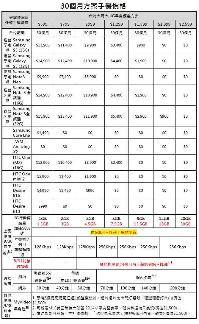 - 註 1.30 個月方案自 2014/8/1 至 2014/09/30 止,以上各專案皆須綁約 30 個月並搭配 4G 手機方案指定資費 (部分專案綁約期間另依專案規定),須預繳。