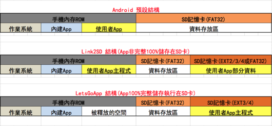 Android系統的應用程式運作說單純也不單純,因為系統運作的關係,一個應用程式的執行有牽涉許多的內部檔案,所以透過Link2SD搬移的APP有些會被強制留在手機內存的空間上,只能搬移部分檔案到SD記憶卡上。以完整性搬移來說,LetsGoAPP這部分做得很好!