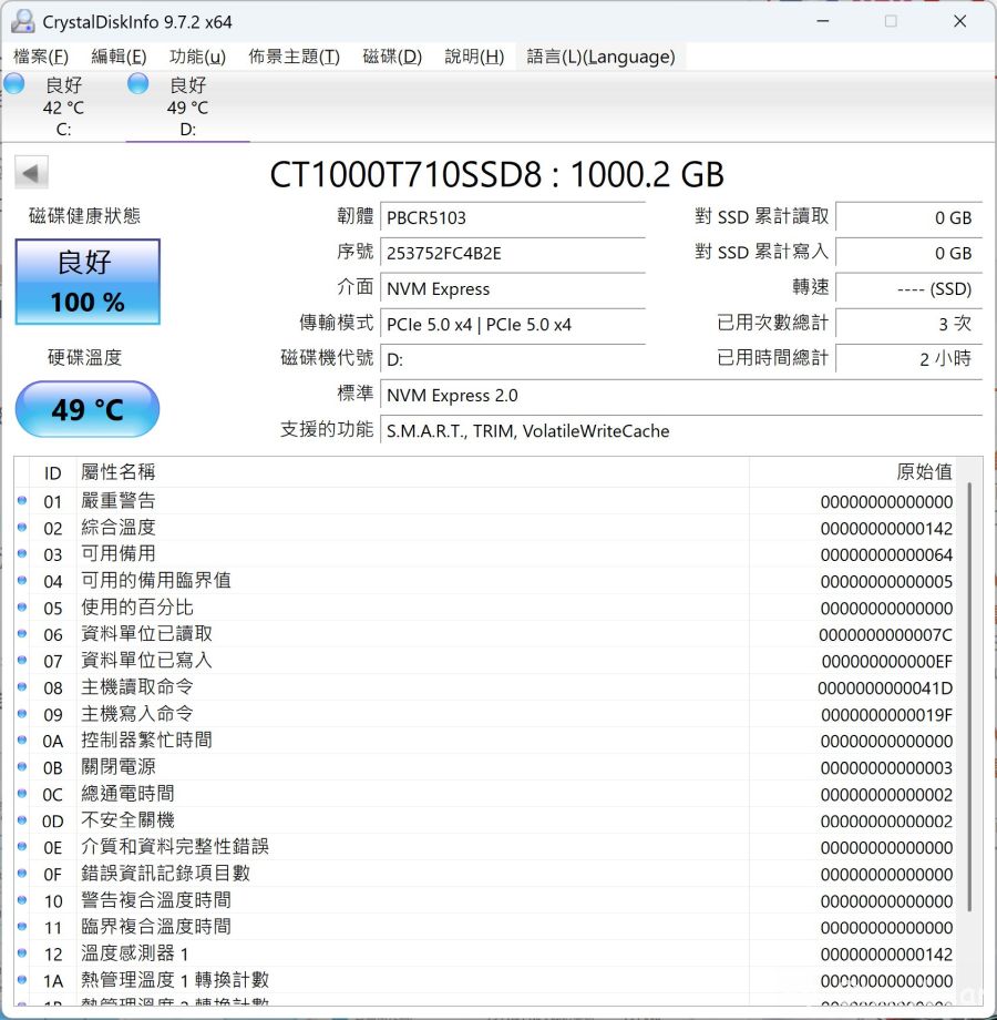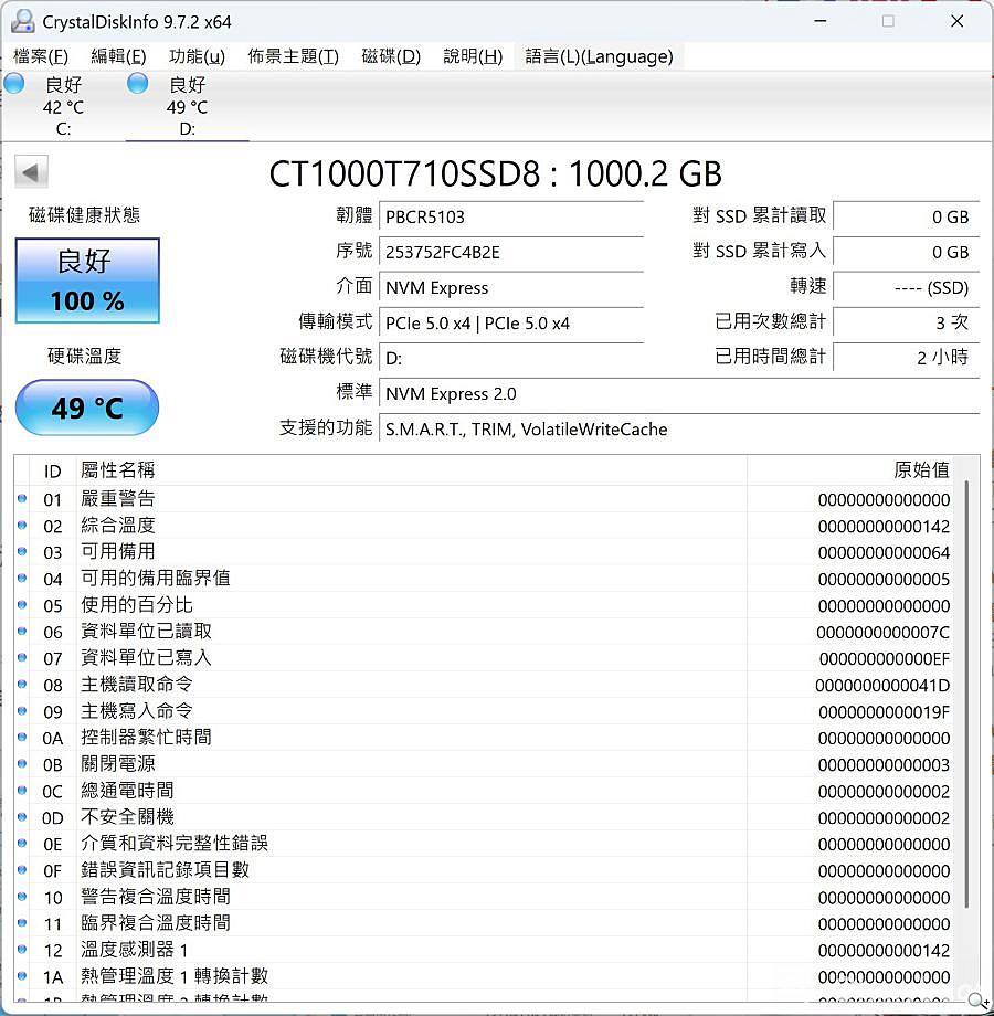 於室溫27度下,待機大約45~49度跳動。標示容量為1000GB,換算實際容量約931GB。傳輸模式確認為PCIe 5.0 x4,理論頻寬雙向可到15.754 GBps/S,即16132MB/S。